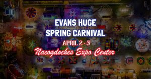 Details Event by Evans United Shows and Nacogdoches County Exposition & Civic Center Nacogdoches County Exposition & Civic Center Duration: 4 days Public · Anyone on or off Facebook April 2-5 Nacogdoches Expo Center FREE Admission & FREE Parking! Carnival Hours: Weeknights: Open at 6 PM Weekends: Open at 1 PM RIDE ACCESSEach rider must have 3+ coupons or a wristband to ride. Armbands […]