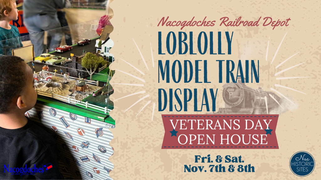 Loblolly Model Train Display Veterans Day Open House Friday & Saturday November 7th & 8th Nacogdoches Railroad Depot, 101 Old Tyler Road The beloved Loblolly Model Train Display returns to the historic Nacogdoches Railroad Depot for a special Veterans Day Open House weekend. This year’s display will honor the 80th anniversary of the capture of Iwo Jima, a significant turning point in World War II. The exhibit will feature a military-themed layout recognizing the courage and sacrifice of those who served, as well as the essential role of railroads in supporting wartime logistics and transportation. Visitors can enjoy the intricate model train setups, meet the Loblolly Crew, and learn about how the railroad shaped Nacogdoches’ growth and connected communities across the nation. Admission is free. Following the open house, the annual Loblolly Model Train Display will return for its holiday season exhibition, opening Friday after Thanksgiving and running for three consecutive weekends. Organizations interested in scheduling a group tour or field trip to view the model train display can contact historicsites@nactx.us for more information. “These events are a wonderful way for families to experience Nacogdoches history together,” said Historic Sites Manager Veronica Amoe. “From learning historic trades to exploring railroads and military history, these programs make our past accessible to all ages.” For more information about these and other upcoming programs, visit www.nactx.us/historicsites or follow Nacogdoches Historic Sites on Facebook and Instagram. For questions, call 936-560-4441