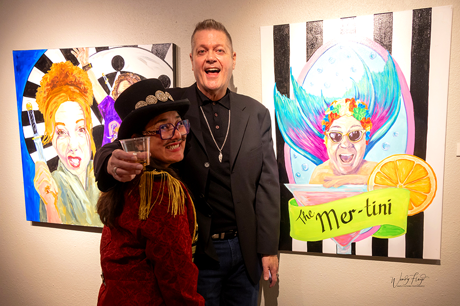 We kicked off our new location with the November 17 opening reception for Michelle Filer’s painting show “Nacogdoches Carnival Oddities” and it turned into a real happening.  The dozen paintings feature local favorites depicted as carnival sideshow characters.  The paintings were draped and then revealed by the artist one by one with the painting subject front and center for the big reveal.  A gaggle of Nacogdoches faces were seen in the crowd and a large time was had by all.