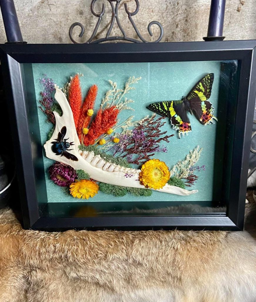 “We’ve shown our work in Lufkin, Tyler, and Longview, as well as Nacogdoches.” said Kirby. “Not everyone appreciates it, but those who do, really love it.” Their reputation has grown in recent years, fueled by their Facebook page, ladybonesbaubles. People often bring them donations of raw materials for future projects. “We get cicadas, butterflies, and bags of animal bones.” But Justin emphasized that “it’s important to honor the remains of this animal that once was alive.” That said, there are limits to what they can legally use. “Any protected species, such as owls, or anything covered by the Migratory Bird Act, for example, is off the table. We won’t use them because legally, we can’t,” said Kirby. “Still, we have a friend with a 3-D printer and we’ve been experimenting with printing facsimiles of bat skulls or other bones we can’t obtain otherwise,” Justin said.