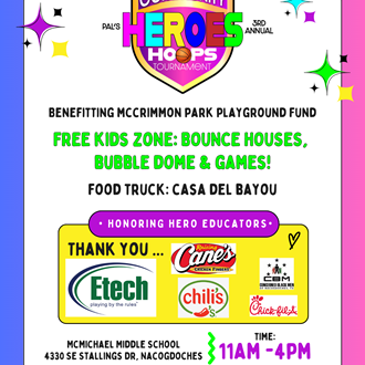 PAL’s 3rd Community Heroes Hoops Tournament brings local basketball enthusiasts onto the court! Players must be at least 16 years old to play in this 3-on-3 tournament, hosted by the Parks Advocacy League of Nacogdoches. This year’s hero theme is Educators! All 10 teams are named after nominated teachers and educators.