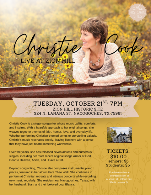 Seats available for Christie Cook Concert TONIGHT at Zion Hill!