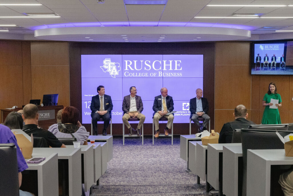 Former SFA Regent Judy Larson Olson, senior vice president at Woodforest National Bank in The Woodlands, moderated the panel and asked the two dozen industry experts in the audience to stand during the discussion. Then she asked those who intentionally joined the banking and wealth management industry to sit down. Half remained standing and said they had initially intended to pursue other career paths like politics and construction.