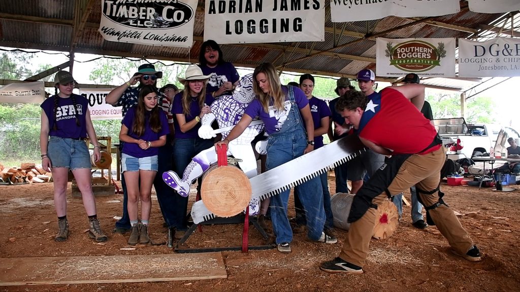 Nearly 30 Stephen F. Austin State University students helped the Sylvans earn its seventh consecutive victory and sweep all the collegiate events at the Louisiana Forest Festival April 25 in Winnfield by scoring 54 points overall. No team has ever swept all the competition’s events. Louisiana Tech University came in second with 40 points, and the University of Arkansas at Monticello placed third with 35 points. View the Sylvans’ LFF videos at gosfa.com/SylvansLFF.